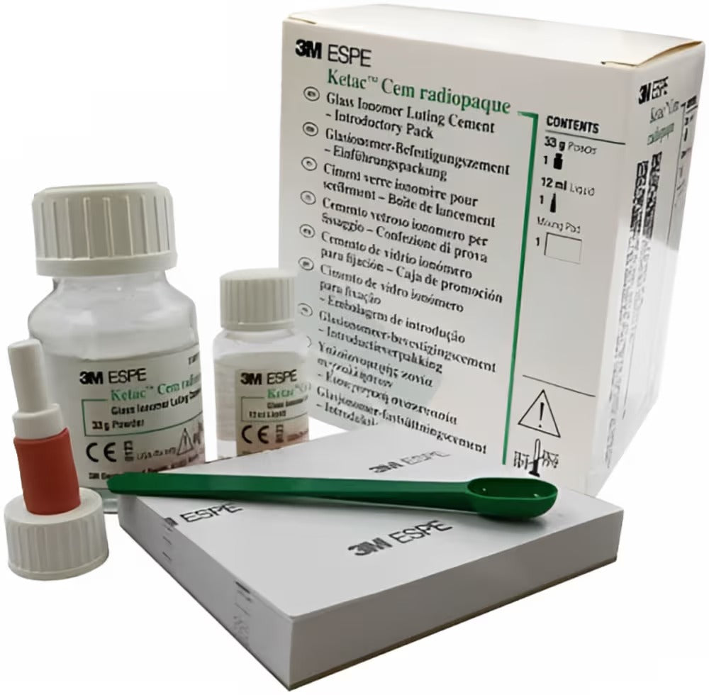 3M Ketac Cem Radiopaque Luting Glass Ionomer Cement (GIC) is a high-quality dental material designed to provide reliable bonding in a variety of restorative and prosthodontic applications. Developed by 3M, a global leader in dental solutions, this luting cement offers excellent adhesion, radiopacity, and durability for enduring restorations.