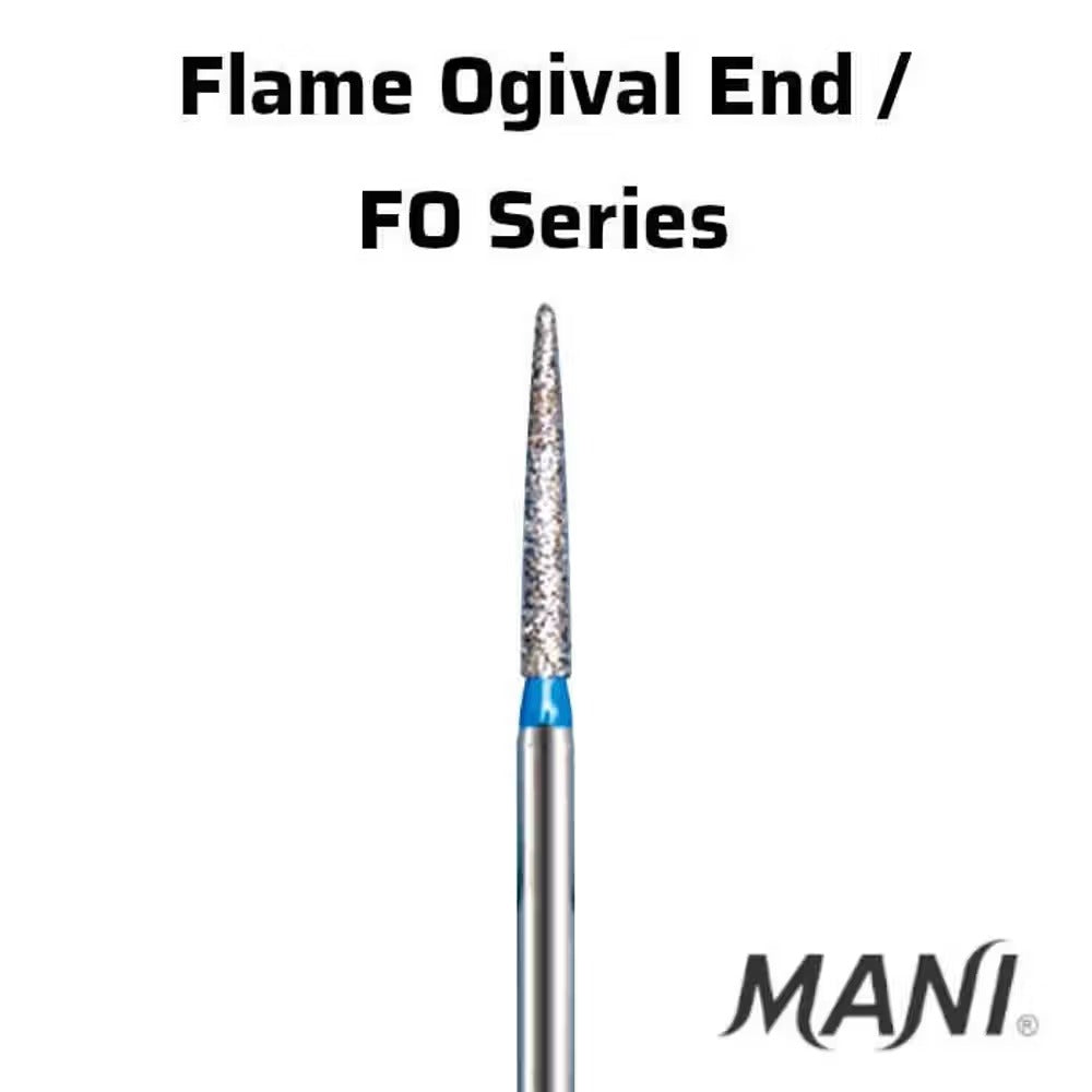 Mani Flame Ogival (FO) Series Diamond Burs with Regular Shank are advanced dental instruments designed for meticulous tooth preparation with precision and efficiency. Manufactured by Mani, a trusted name in dental products, these diamond burs are tailored to meet the demanding standards of dental professionals.
