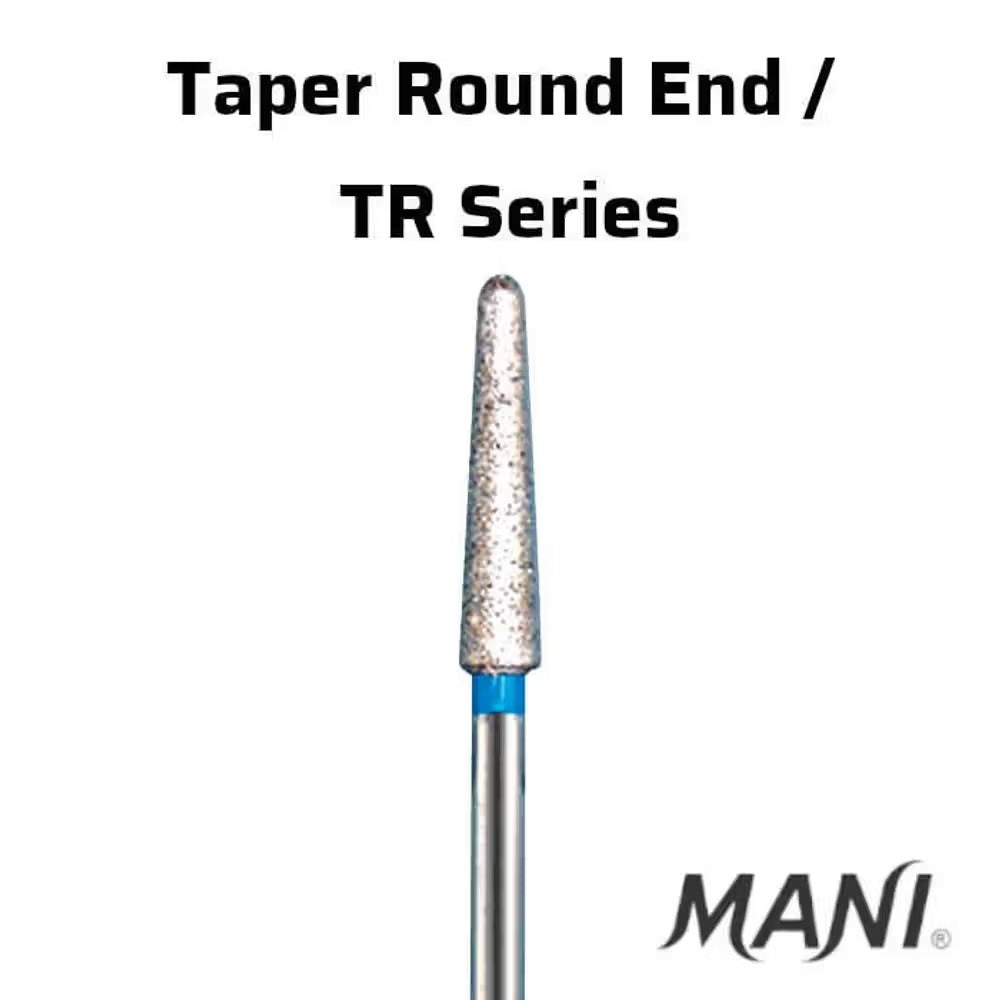 The Mani Taper TR Series Short Shank Diamond Burs are small, rotary cutting instruments used in dentistry. They are designed for precision and accuracy when it comes to reshaping and preparing teeth during various dental procedures. The "TR" designation often indicates that these burs have a round end (as opposed to flat-end or tapered burs) and are suitable for specific tasks in dental work.